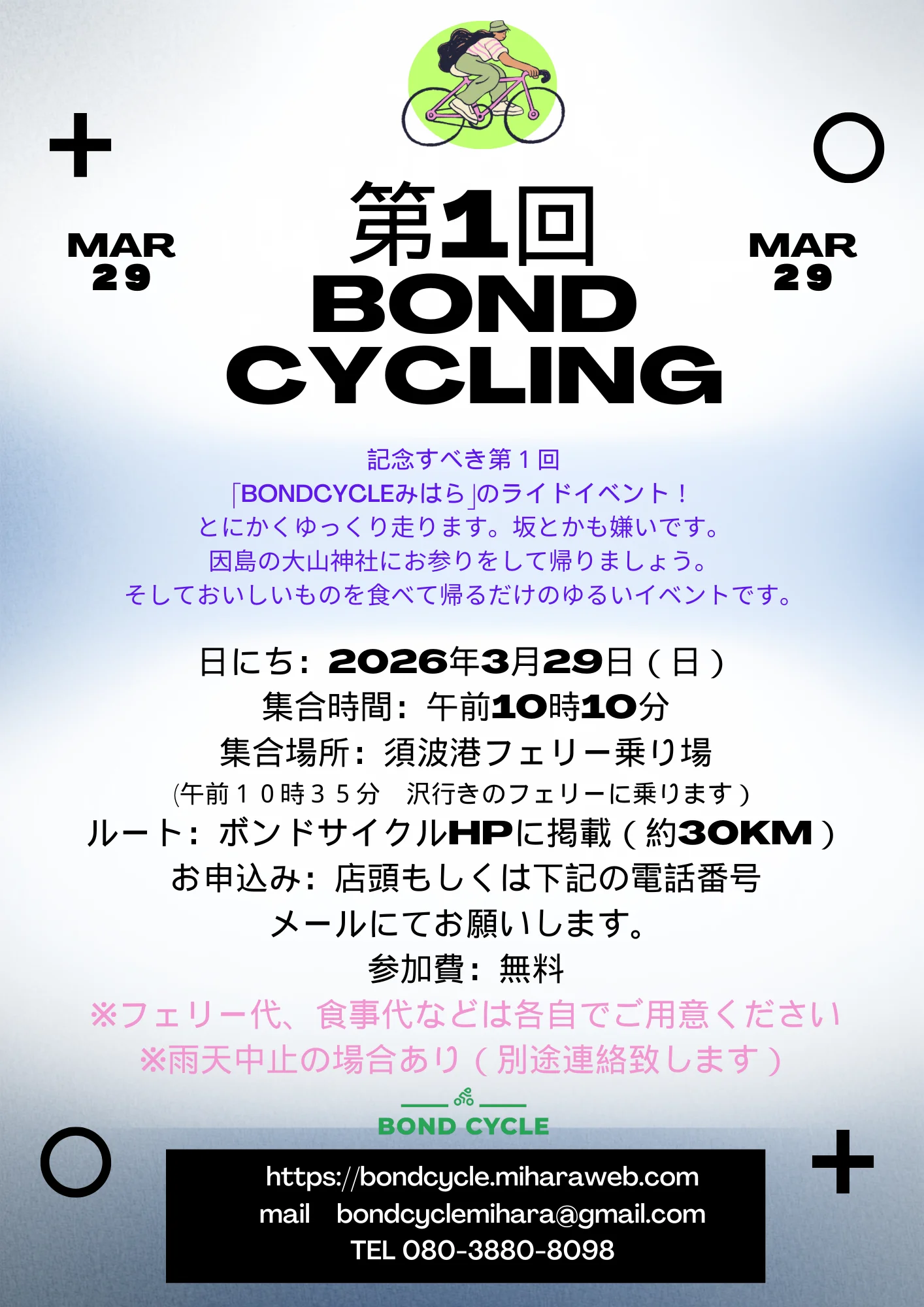 BONDCYCLEみはらでは、記念すべき第1回サイクリングイベントを開催します。 目的地は、サイクリストの聖地としても知られる因島・大山神社。 フェリーを使い、しまなみ海道の島々をゆったり楽しむサイクリングイベントです。 初心者の方も大歓迎。みんなで一緒に春のしまなみを走りましょう。